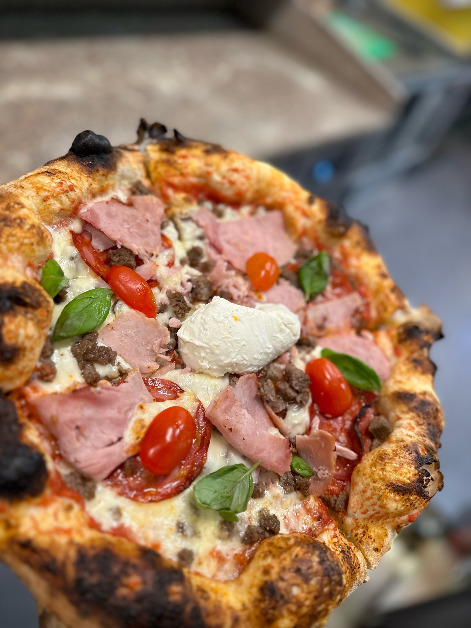 Tomatsós, feskur mozzarella ostur, neytakjøt, skinka, pepperoni, bacon, frískt basillikum & cherry tomatir