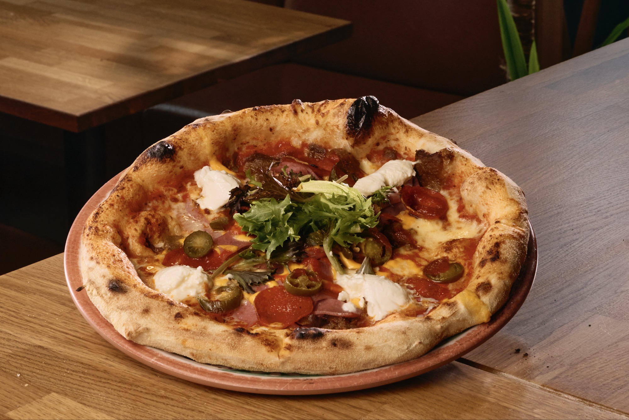 Tomatsós, rivin Mozzarella, shawarma, pepperoni, skinka, jalapeno, heimagjørd chili dressing, cheddar sós & rukola