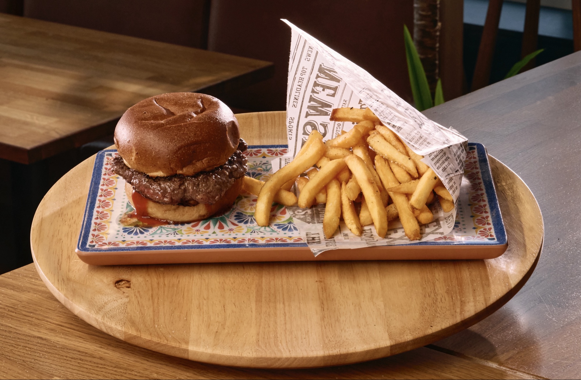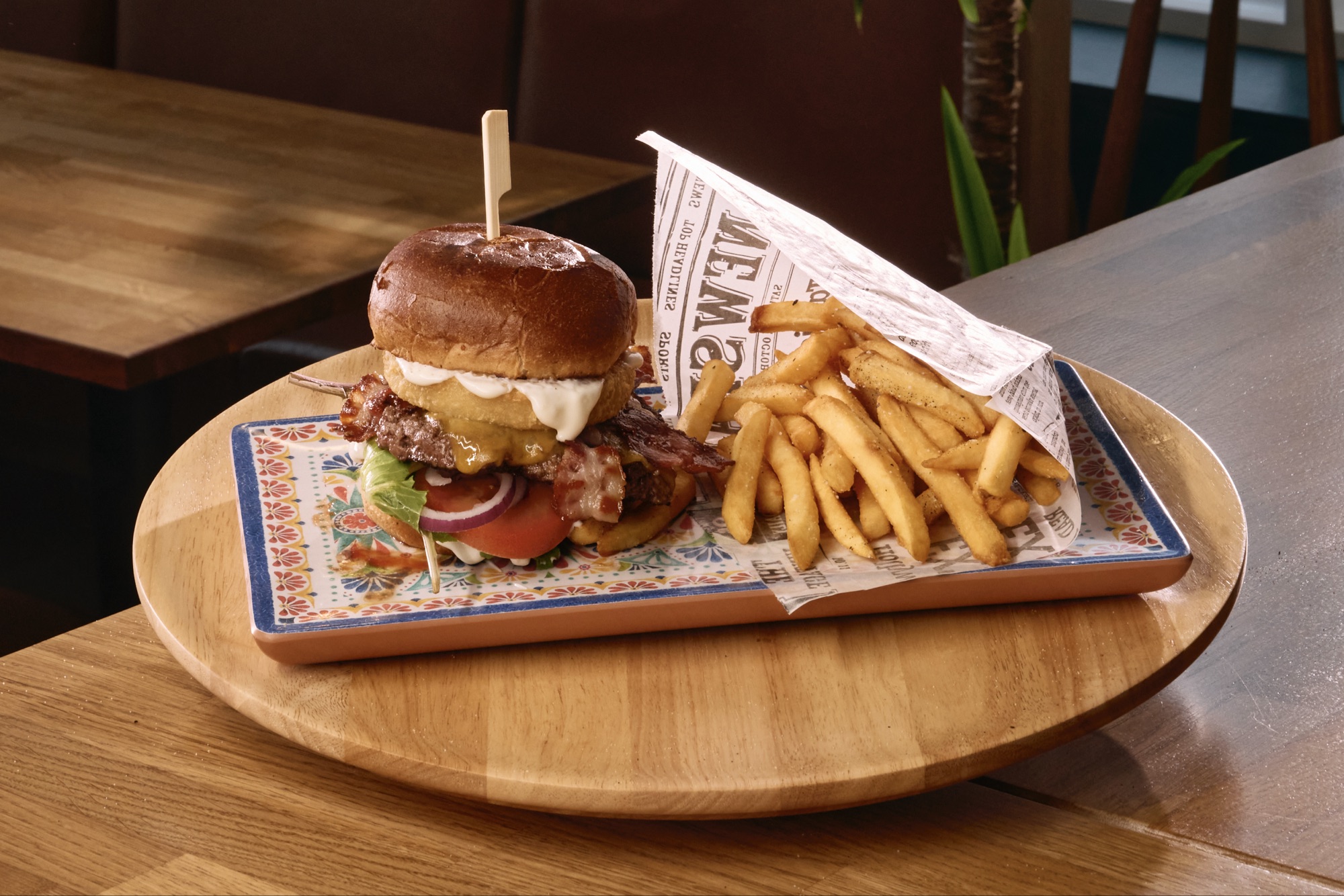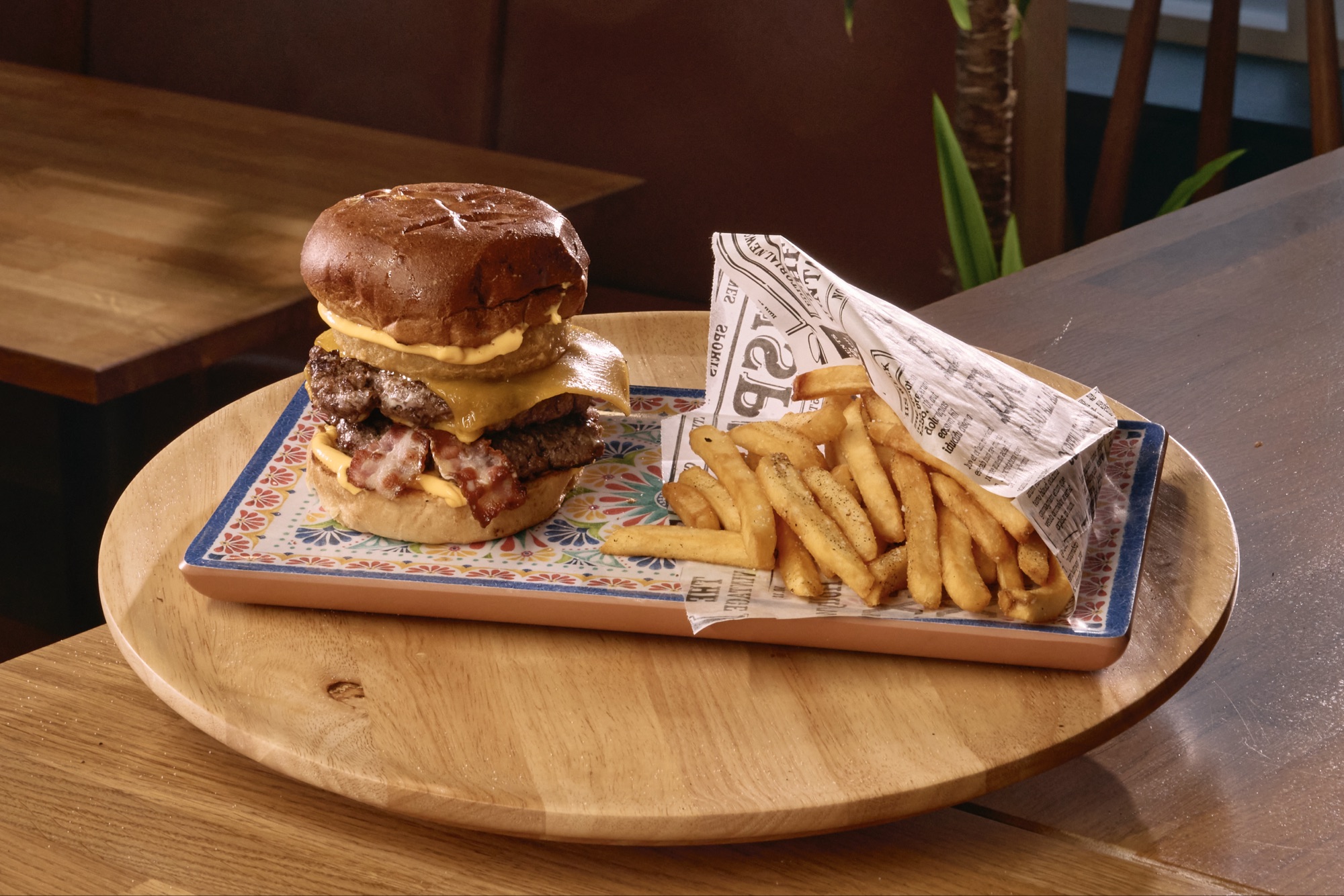 Brioche bolli, 200gr búffur av góðum malnum kjøti, 3 sløg av osti, rukola, tomat, reyðleyk, aioli