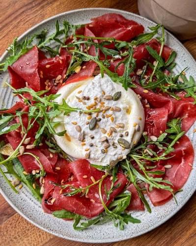 Tomatsós, feskur mozzarella ostur, shawarma / neytakjøt, reyðleykur, salatmix, cherry tomatir & valfrí dressing